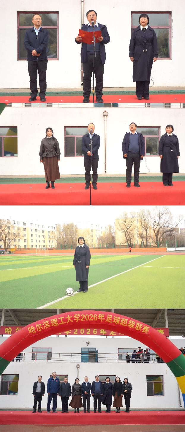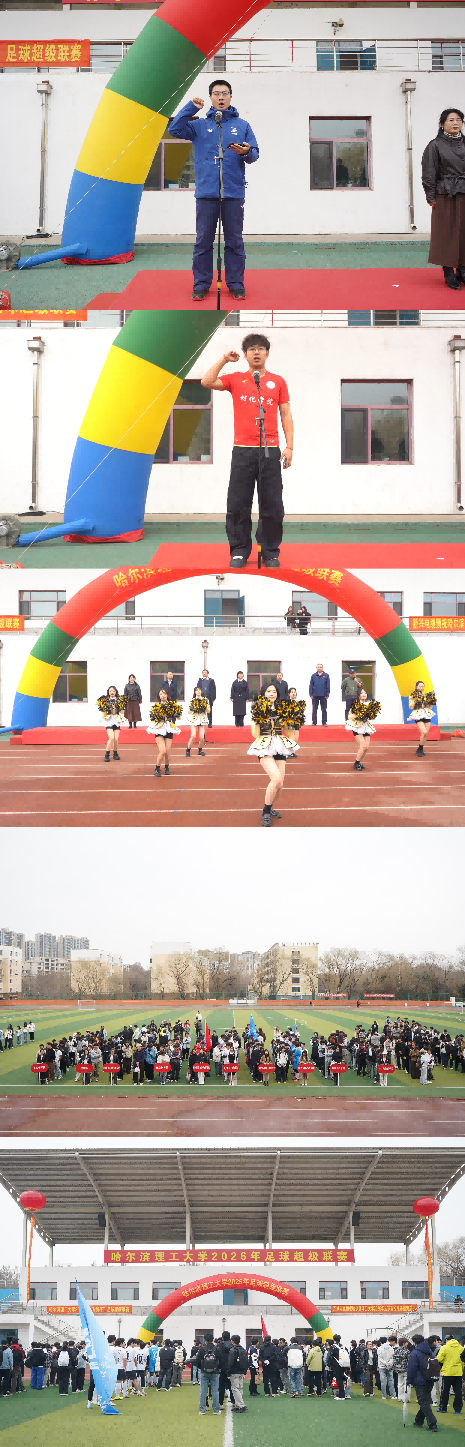 为全面贯彻党的教育方针,全面落实立德树人根本任务,树立“健康第一”理念,深入推进《哈尔滨理工大学学生体质提升专项行动实施方案》的执行。4月16日,哈尔滨理工大学2026年足球超级联赛,在南区体育场隆重开幕。党委学生工作部部长戴湘竹、校团委书记韩彧博、电气学院党委书记刘骥、体育教学部主任董少伟、党委学生工作部副部长田海燕、校团委副书记段云菲、电气学院党委副书记李国辉、体育教学部副主任孙树滨、体育教学部主任助理白铂以及来自全校各学院、体育教学部的领导、老师出席了开幕式。运动员、教练员、裁判员和观众近400人齐聚一堂,共同见证这场充满青春活力与拼搏精神的校园体育盛会。